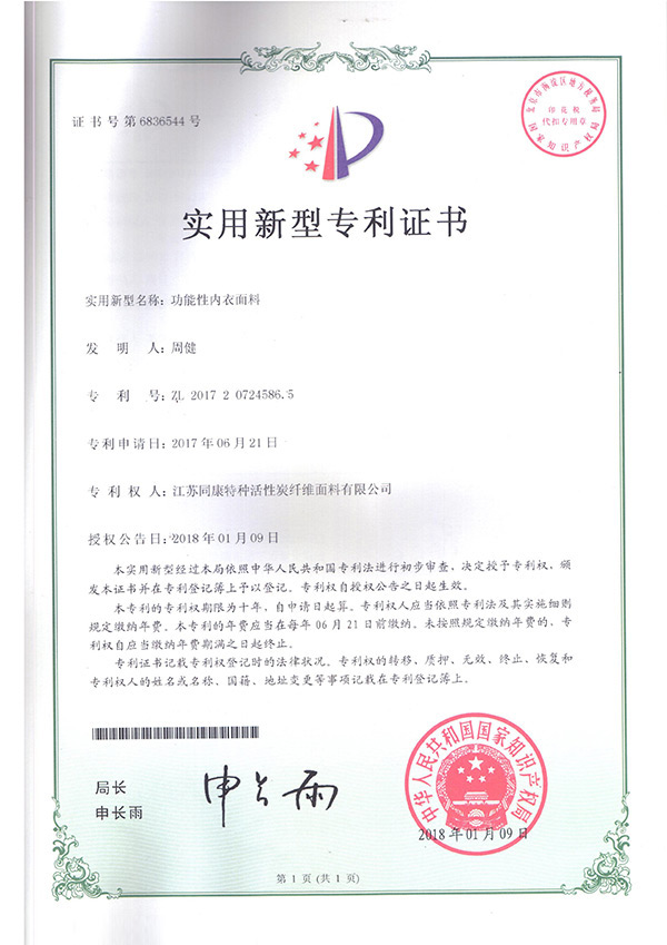 專利證書功能性內(nèi)衣面料