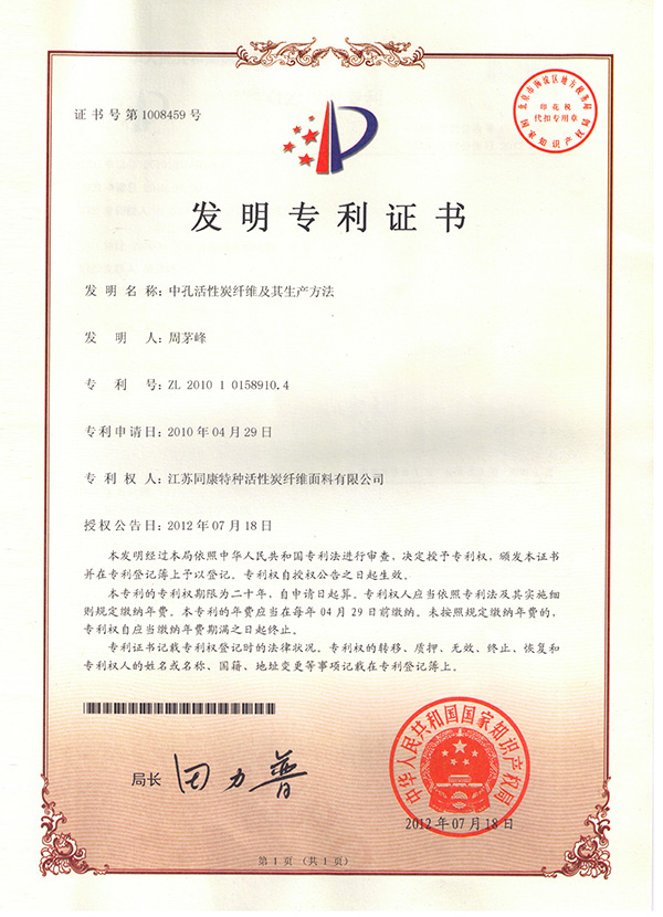 發(fā)明專利(中孔活性炭纖維及其生產(chǎn)方法)